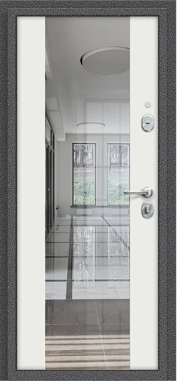 Надежная входная Дверь Браво Север-7 Антик Серебряный/Белый Зеркало премиум класса по цене 31 475 руб. Большая толщина стали защитит от проникновения в ваш дом, квартиру или коттедж. Используется очень качественная фурнитура: замки, цилиндры, ручки, защелки. Покрытие и отделка двери изготовлено под внимательным контролем производителя. Дверь имеет долгий срок службы и гарантию.
