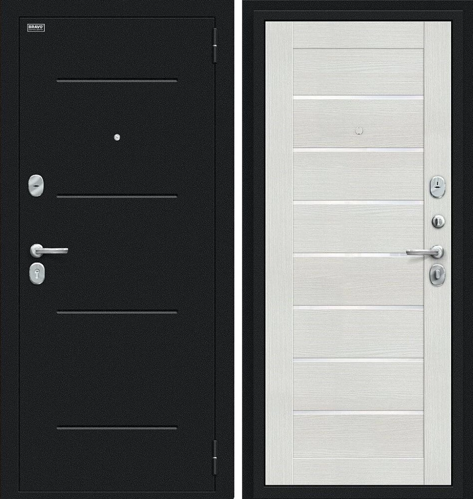 Надежная входная Дверь Браво Техно Букле черное/Bianco Veralinga премиум класса по цене 31 325 руб. Большая толщина стали защитит от проникновения в ваш дом, квартиру или коттедж. Используется очень качественная фурнитура: замки, цилиндры, ручки, защелки. Покрытие и отделка двери изготовлено под внимательным контролем производителя. Дверь имеет долгий срок службы и гарантию.